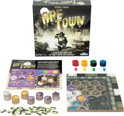 A high-stakes mob game of turf, power and bananas! The apes have taken over, and it's every primate for themselves! In this gritty cityscape, competing gangs battle for control, armed with ambition, muscle and the occasional banana. Invest in lucrative districts, outsmart your rivals and fight for majority rule. Instant points or long-term dominance? Every tile placement is a tactical decision in the race to become the top silverback. A game by Reiner Knizia.