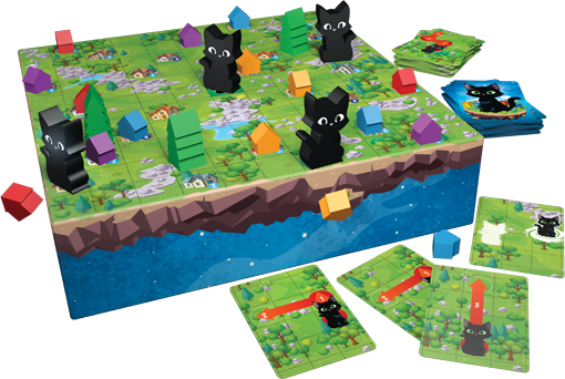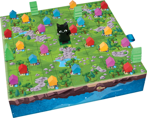 Cat Earth is a fast-paced board game with a comic conspiracy theory twist. Giant mischievous cats roam a flat world, knocking houses off the edge of the board as players use movement cards to stay one step ahead. Includes wood meeples and a pull-out box to use as the playing surface. A game created by Gareth Edwards. Contents: 4 wood cats, 40 wood houses (in 4 colours), 4 wood trees, 40 cards, game board.