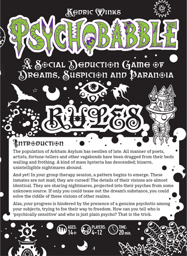 This intense social deduction game asks one player to take the role of the Psychotherapist who guides the other players in a group discussion of their shared dreams. Most will know what happened in last night’s vision, but one will be genuinely insane and unfortunately, does not know it! It’s up to the Psychotherapist to make sense of the statements and interpret the dreams while the inmates must uncover the madman hiding among them! PsychoBabble is the social party game that engulfs you in a sea of suspicion, accusations and self-doubt. An experience like no other!
